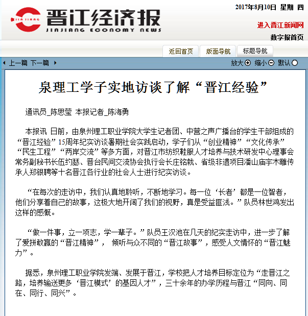 【晋江经济报】泉理工学子实地访谈了解“晋江经验”
