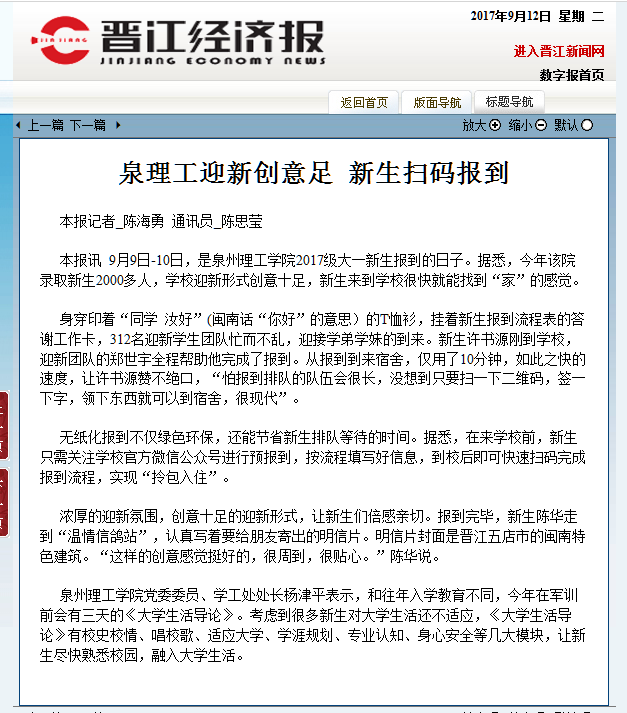 • 【晋江经济报】泉理工迎新创意足 新生扫码报到