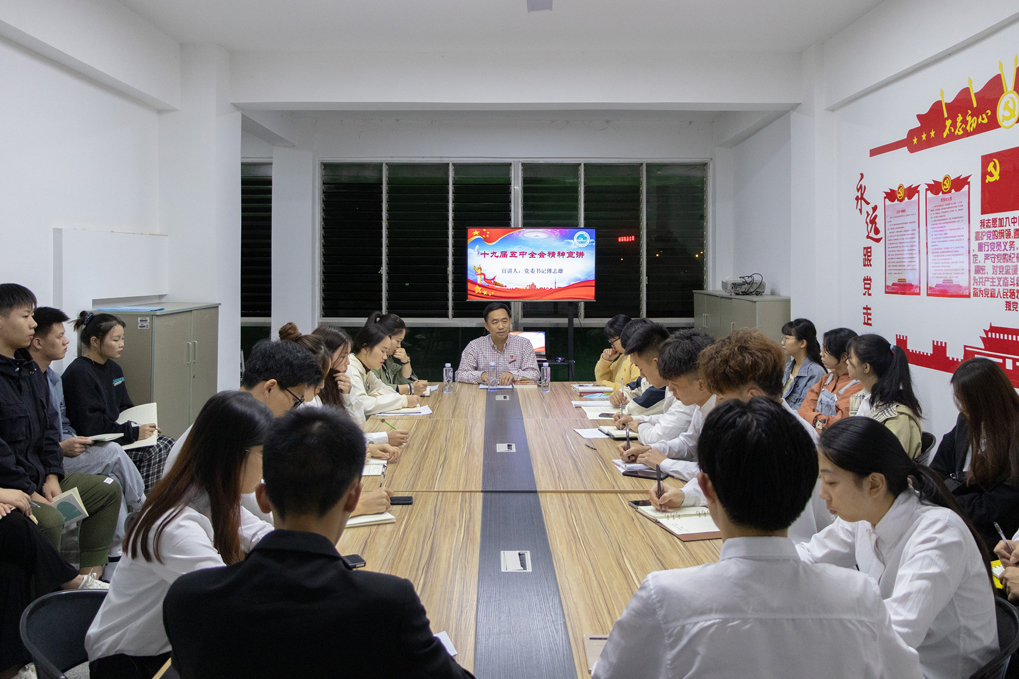 11月28日,双馨书院2122党团活动室气氛热烈,党委书记傅志雄为20多名学生干部代表讲述了十九届五中全会的重大意义、方针原则、主要目标、重点任务以及远景目标等内容。 为深入学习贯彻党的十九届五中全会精神,我校...