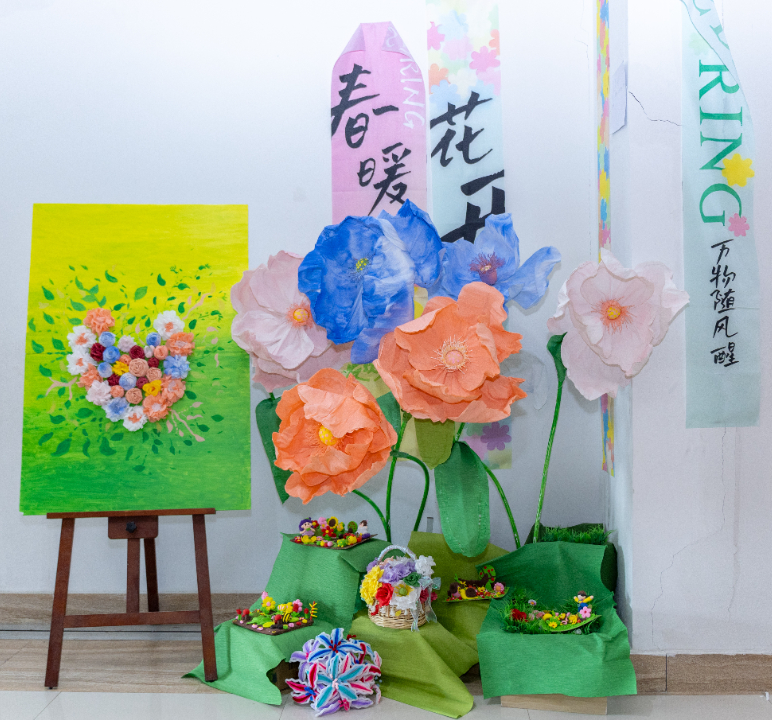 比赛期间,教育学院4楼实训室的备赛间,处处是选手们忙碌的身影,为达到理想中的效果,同学们不断打磨、试验。团队成员各司其职,用团结协作和精益求精的精神,将创意凝聚成独一无二的环创作品。《巨人的花园》团队从绘本故事解构出发,历经数十次设计修改;《万物新生》团队为了呈现“破茧成蝶”的视觉张力,反复试验了3种材质的蝴蝶翅膀透光效果;《春之颂歌-自然的礼赞》团队为了还原田野肌理,手工雕刻200余片纸质麦穗。