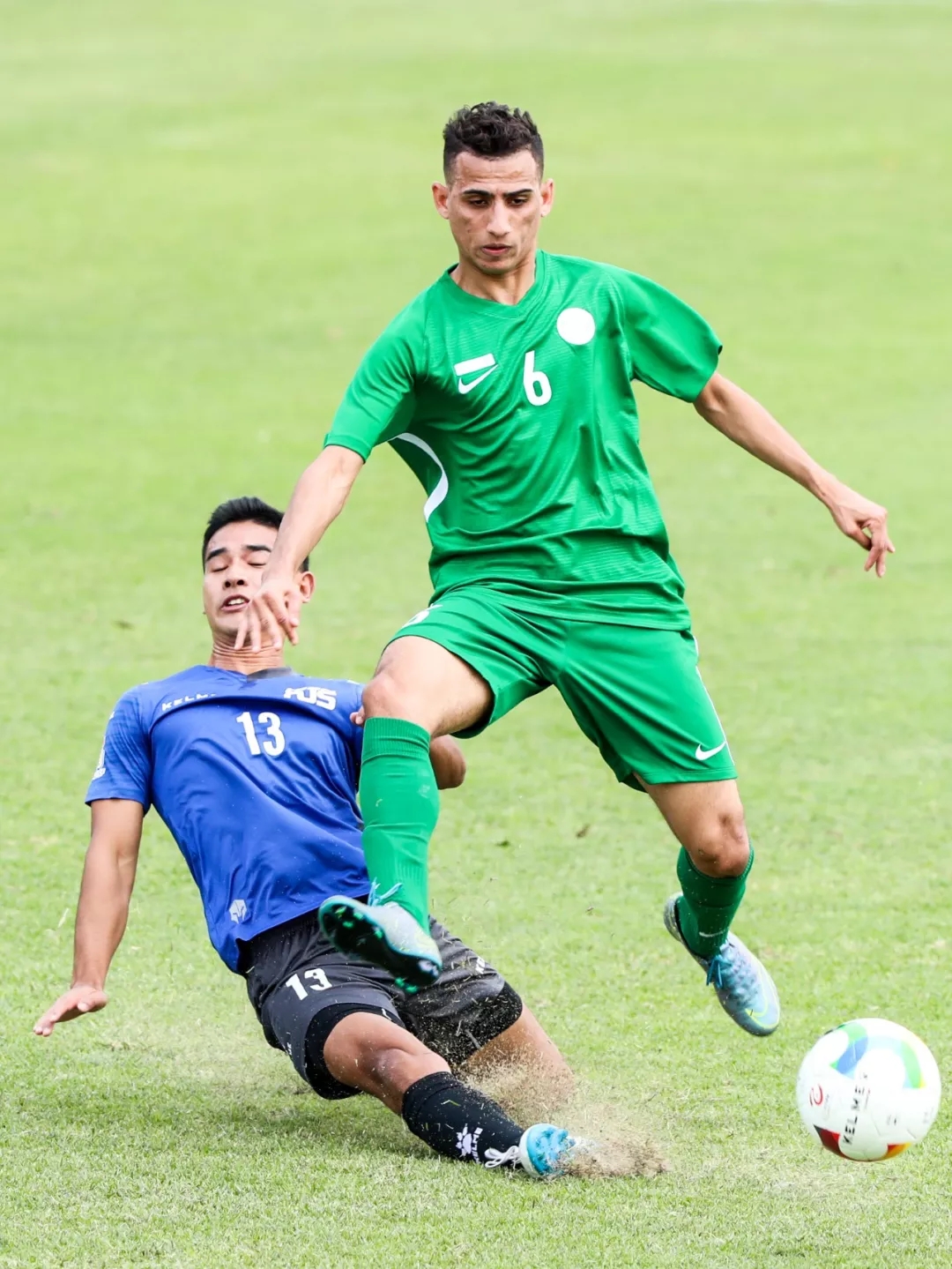 沙特阿拉伯费萨尔国王大学6号球员AHMED AL JUWAYD(艾哈迈德·阿尔贾维德)与新加坡国立大学13号球员Lionel Retnam(莱昂内尔·雷特南)在中场激烈拼抢
