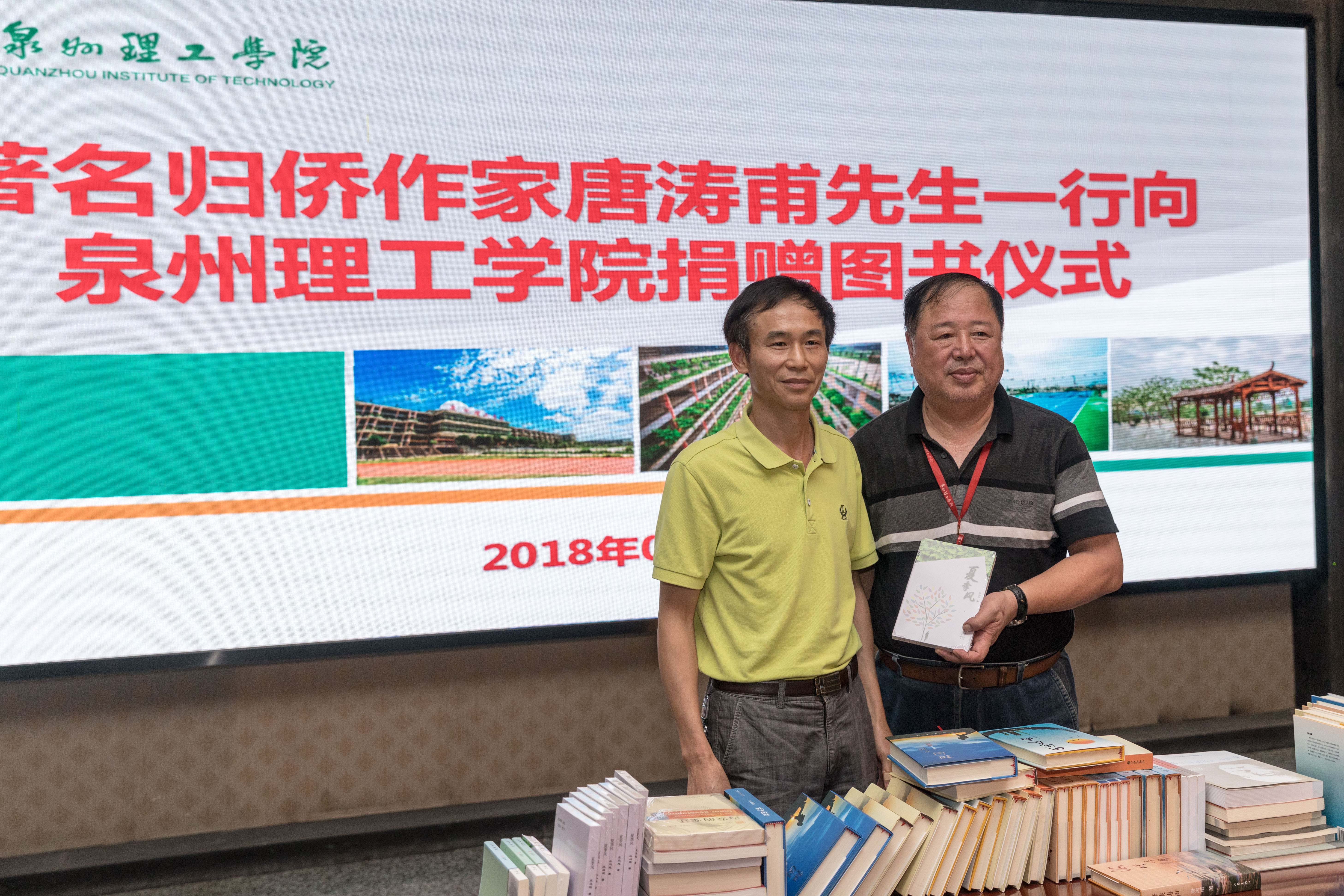 6月20日下午, 著名归侨作家、福建省作家协会、福建省法学学会会员唐涛甫先生带着他创作的七部书籍来到泉州理工学院,与师生畅谈创作心得。晋江电台台长尤振阳、福建省作家协会会员庄马炮、中国书法协会理事汪真谦等一行来校参加捐赠仪式。