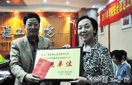 会上,校党委副书记苏白茹传达了市教育系统安全稳定精神,并宣读了学校关于表彰 2010年度基层安全稳定工作先进单位的决定。外国语言系、后勤处、思恩楼公寓管理办公室三个单位在2010年度注重安全教育,维护稳定秩序,全年没有出现任何不良事故,被评为学校授予“2010年度基层安全稳定工作先进单位”称号。校长苏志明教授为三个单位颁发了证书和奖金。