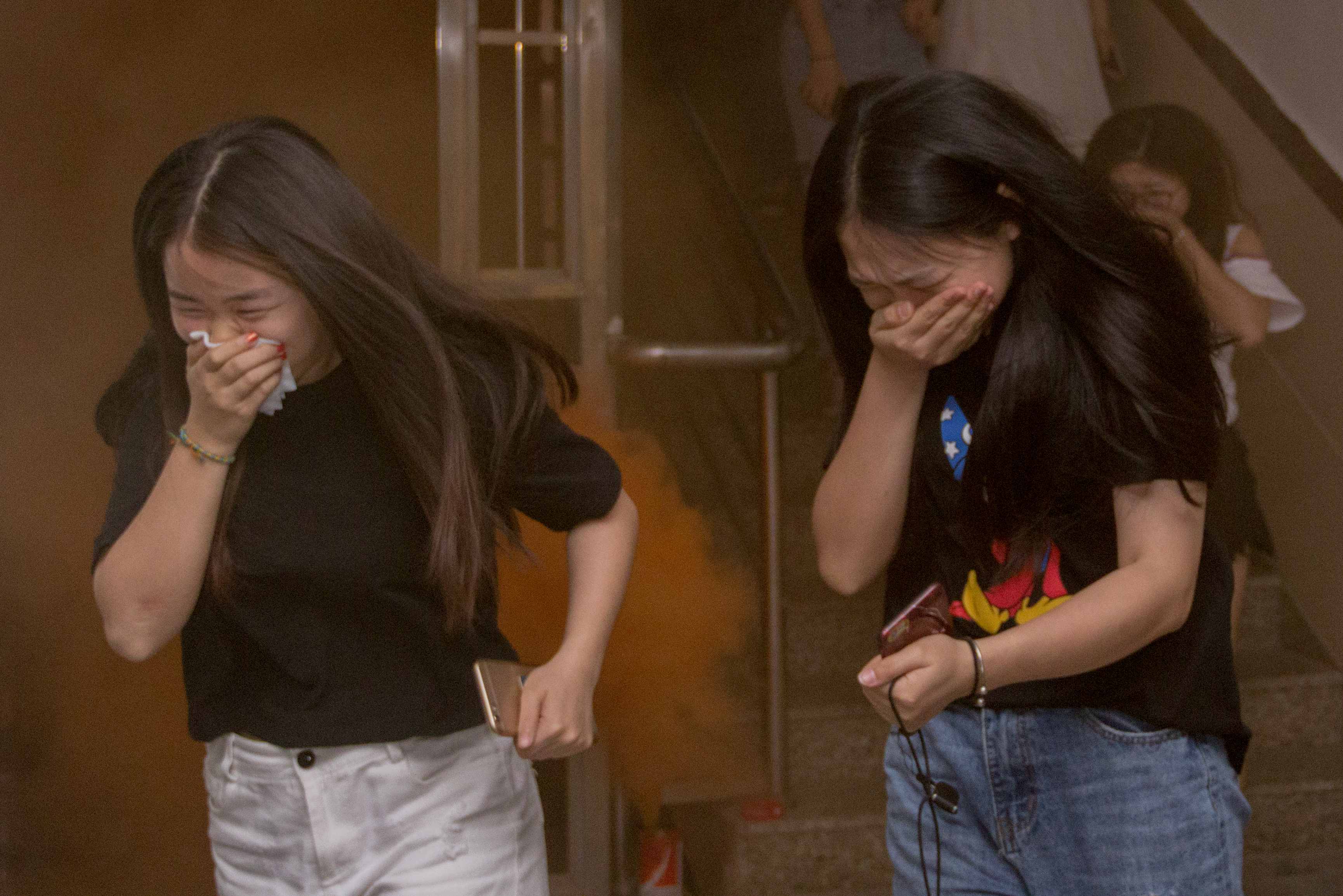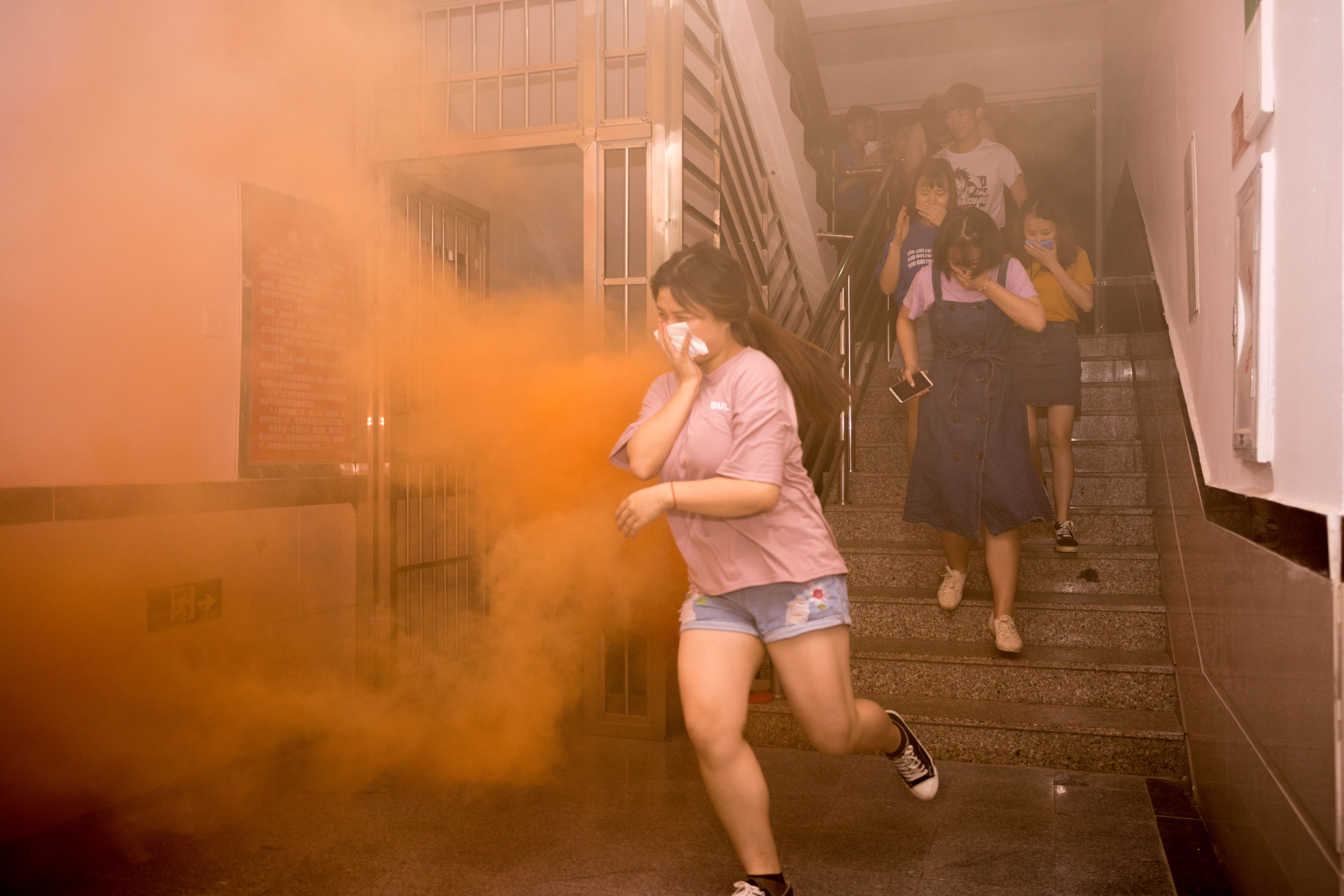 当晚7时许,校园地震、火灾警报声急促地响起,校舍内冒起浓浓的烟雾,学校广播立刻提醒师生们不要慌张,要安全有序地向操场撤离。师生们听从现场指挥的口令,纷纷弯着腰、用毛巾捂住口鼻,沿着指定楼梯口,快速、有序地撤离。