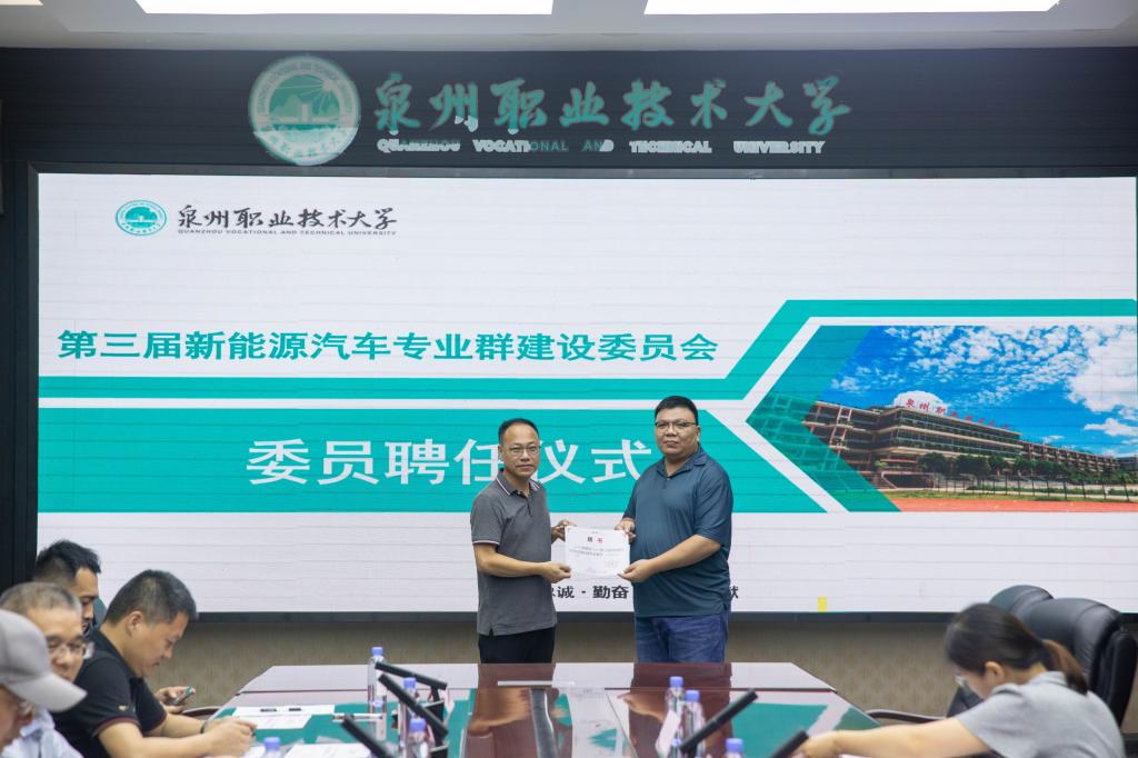 随后进行本次会议的第一项议程,为新聘任的新能源汽车专业群建设委员会主任、副主任以及委员颁发聘任书。