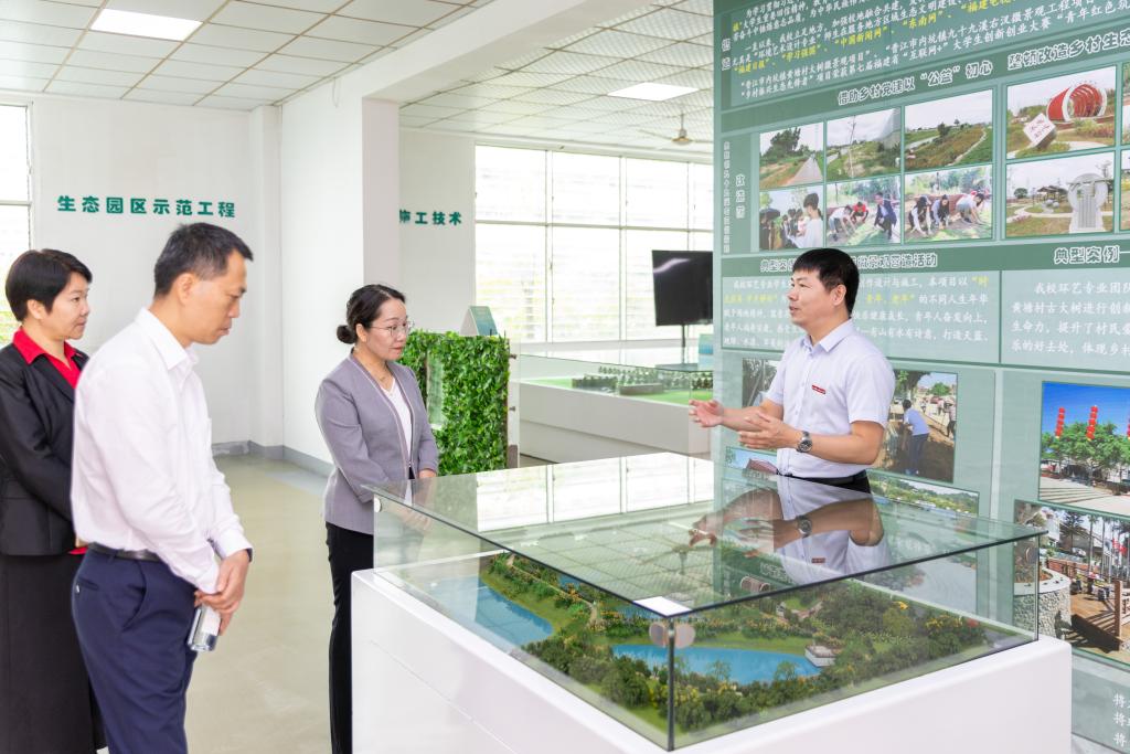 蔡金佩向农秀丽一行介绍学校办学历史、教育特色、人才培养模式以及生态示范校园等,在参观校史馆、各学院教学、实验区的过程中,逐一介绍课程特色、教学特性和研究成果。