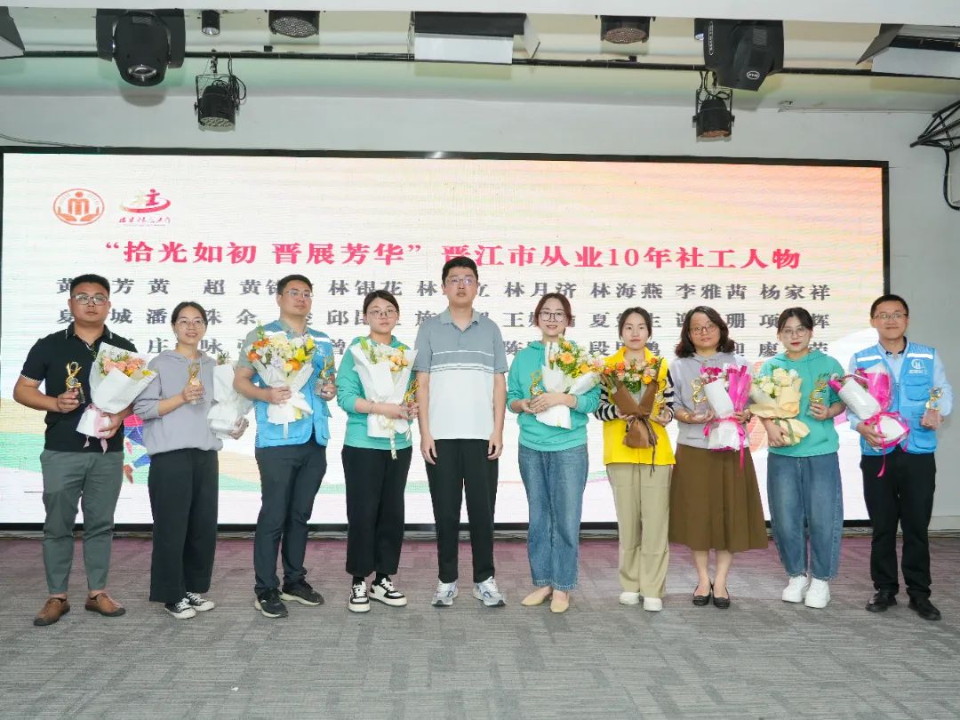 ▲ 周先进、傅一鸣、施世强分别为在晋江市从业10年的社工人物颁发纪念奖杯