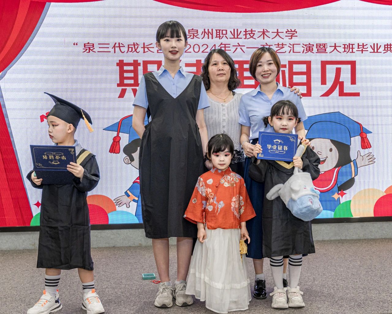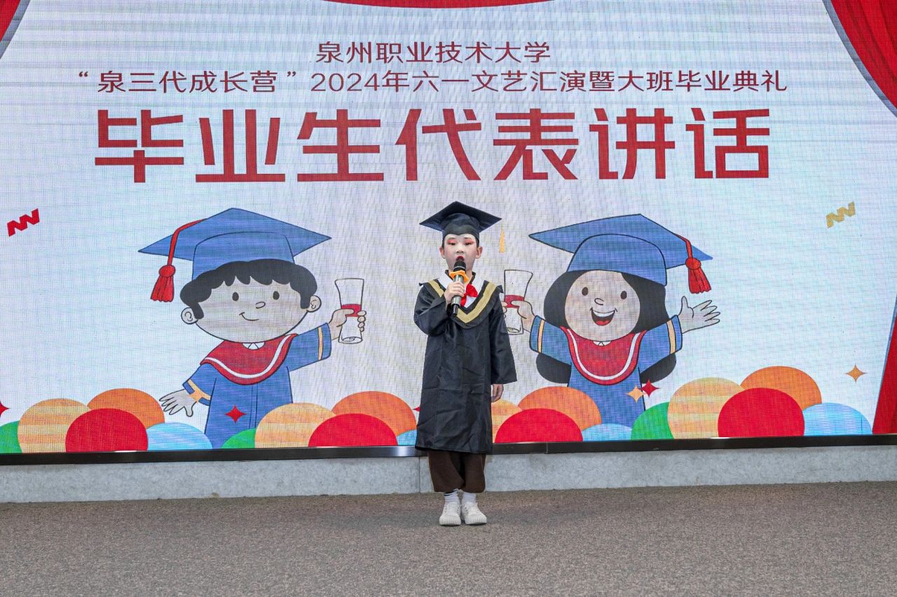 5月30日,泉三代成长营2024年六一文艺汇演暨大班毕业典礼举行。这场活动不仅是为了庆祝六一国际儿童节,这还是成长营大班小朋友们人生中第一个毕业典礼。活动中,孩子们化身小小歌唱家、舞蹈家、画家,用他们清脆的歌声、优雅的舞步和绚丽的画笔,献上一场充满“闽南味”的文艺表演。出席活动的有我校工会主席陈其生、副主席朱冰梅,教育学院院长张君,泉三代成长营负责人欧阳默涵,以及成长营小朋友与家长。