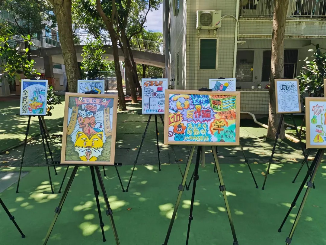 活动现场,展示了同学们手绘的反诈宣传画。同学们将自己对反诈的理解与创意融入画中,用色彩和线条传递出反诈的重要性。