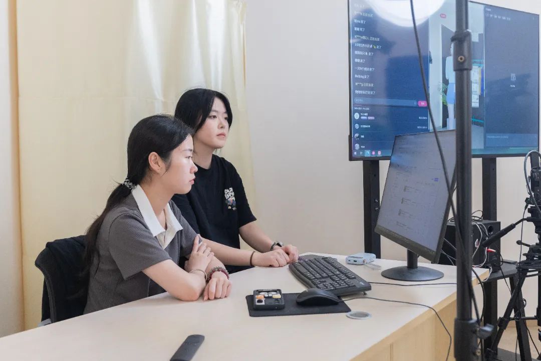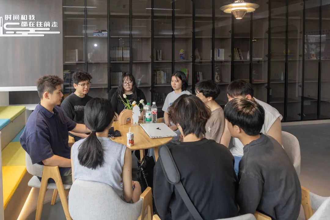 王琬艺(右一)与同学讨论媒体运营