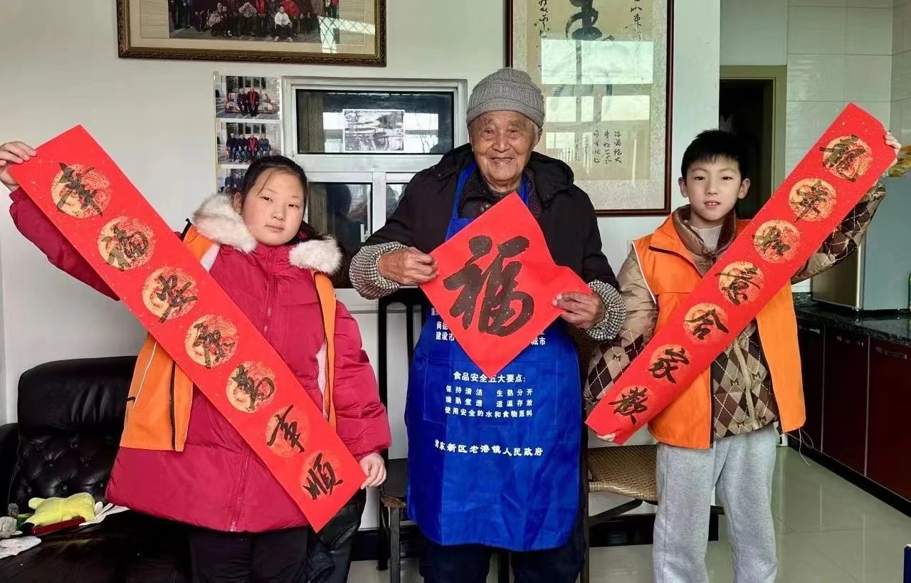 ▲2024年2月1日,上海浦东新区乐耆社工服务社联合老港镇妇女联合会开展“墨香四溢 新春送福”主题活动。活动邀请书法老师教志愿者书写新春对联,小志愿者们将一幅幅满载美好祝愿的春联和“福”字送到辖区内百岁老人、户外工作者以及春节留沪人员手中。