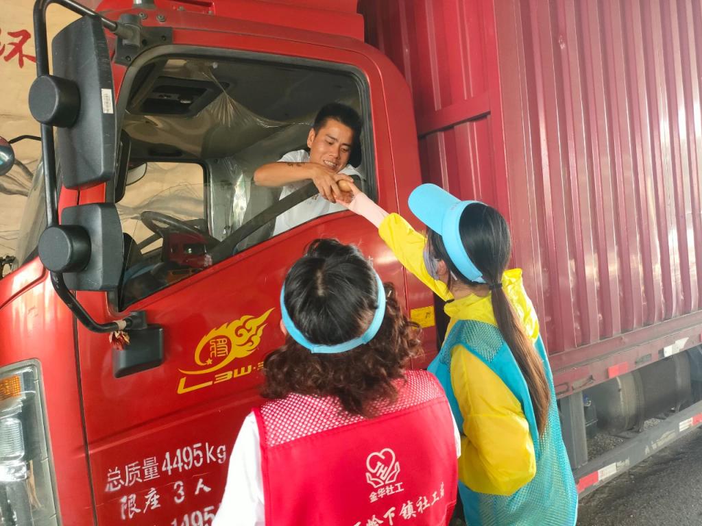 ▲2022年8月初,为应对高温天气,浙江省金华市金东区岭下镇社工站推出“一杯水公益——爱心凉茶致敬户外工作者”活动,为户外工作者送上爱心凉茶、防暑药品等。图为岭下镇高速公路出口处,社工和志愿者一起为货车司机提供凉茶、茶叶蛋等食品。