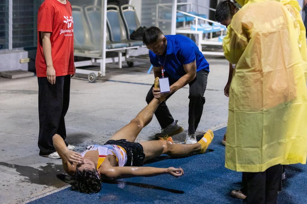 赛场上,健儿紧张拼搏。赛场下,休闲体育专业老师章天宇、王雨轩,正带着学生为健儿们做运动康复。