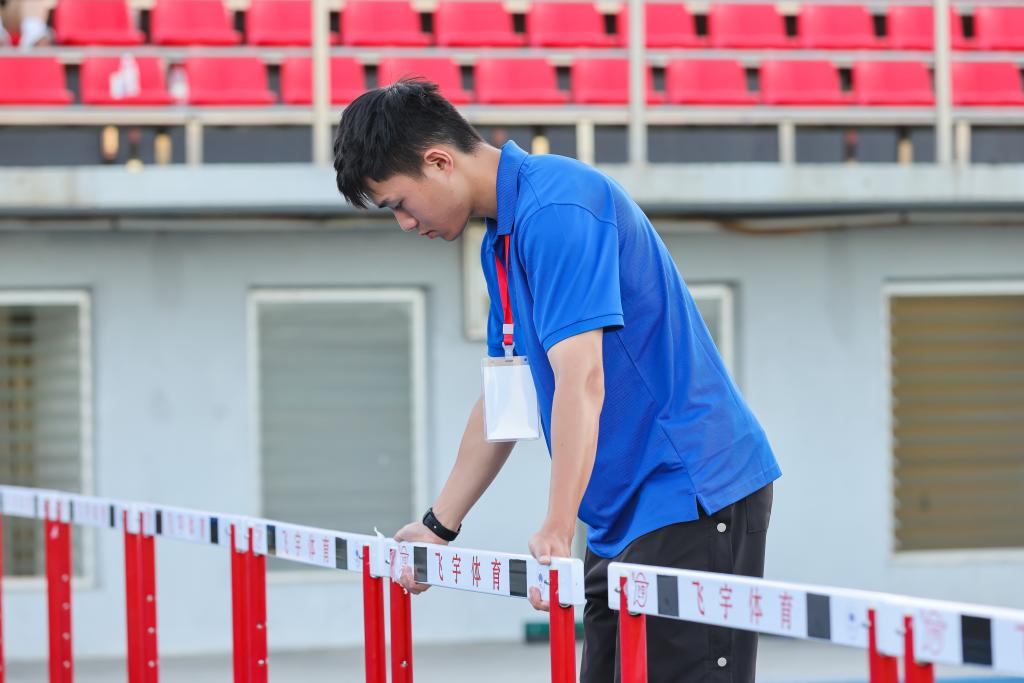 王非易同学在田径赛期间担任助理裁判