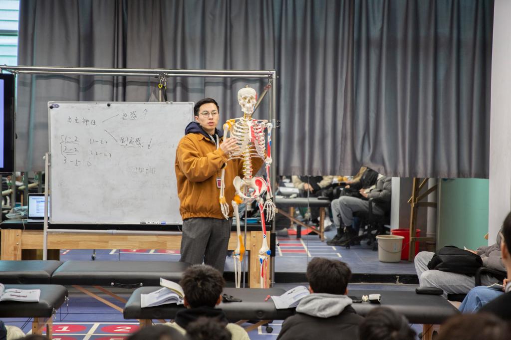 课堂上,老师们从不照本宣科。他们穿上肌肉服讲解运动解剖、带人体器官模具分析发力机制、请学生当“模特”现场处理问题……学生们表示,休闲体育课堂是理论与实践紧密结合的,老师们能将深奥的理论讲得通俗易懂,让学生快速掌握知识与技能。