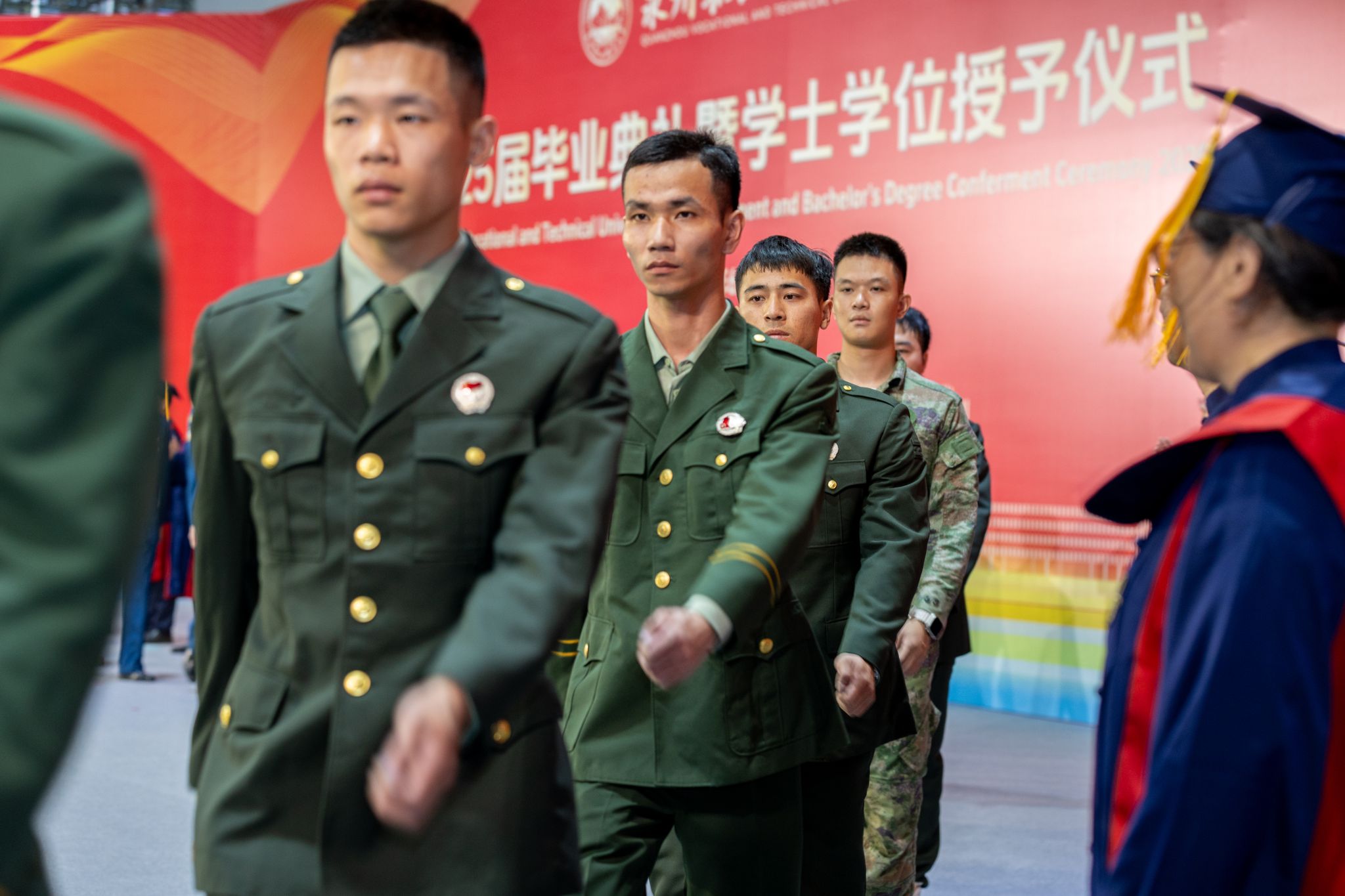 “敬礼!”学士学位授予仪式现场,在拨穗礼毕的瞬间,泉大首个全由退役军人组成的班级2023级休闲体育(专升本)1班的毕业生整齐列队,迅速褪去学士服,身着武警、海陆空三军军装,面向导师与同窗行军礼,勾勒出一段“退伍不褪色”的青春故事。看到这一幕,现场掌声雷动!