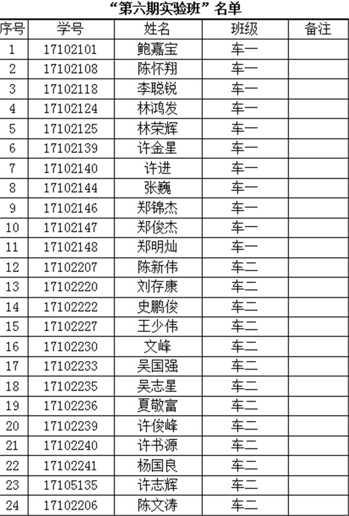 经过报名审核、笔试和面试三轮考核,经卓越技师项目组研究讨论决定共24名学生通过考核;现将“第六期实验班”24名学生成员名单进行公布。“第六期实验班”成员名单如下: