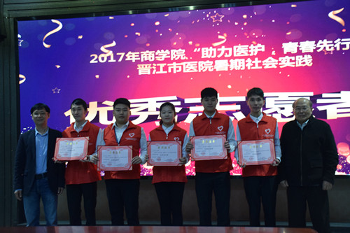 12018315日早上10点,在泉州理工学院第一会议室举行“2017年商学院助力医护,青春先行晋江市医院暑期社会实践表彰大会”。晋江医院党委书记黄东昭先生非常感谢和我校的共建,同学们的辛苦付出也是卓有成效的,希望接下去我们的共建项目和方向更加的多元化,更好的服务晋江,更好的促进志愿服务工作的开展。暑期社会实践晋江市医院主要负责人詹曼艺副主任为本次志愿服务做总结讲话。她说道,同学们的暑期社会实践给医院带去了活力,服务的过程中提出了一些建设性的意见,更好的完成了志愿服务工作,进一步缓解了医患的关系。与此同时,同学们在为期一个月的暑期社会实践,收获了成长,积攒了经验,提高了沟通协调的能力,同时得到很大的蜕变。会议中表彰了在暑期社会实践中表现突出的优秀志愿者。