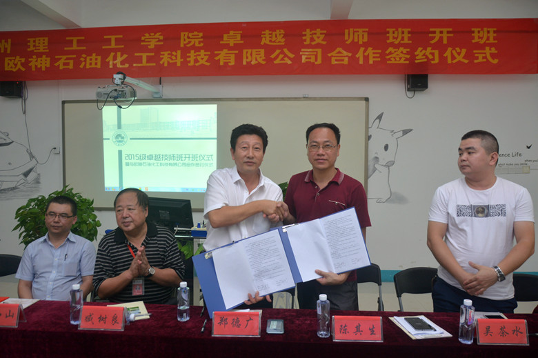 在开班仪式上,学校臧树良校长、工学院陈其生院长、工学院吴茶水书记、福建万里路商贸汽车服务有限公司苏经理、欧神石油化工科技有限公司边腾飞总经理及实验班学生代表依次进行发言。随后,陈其生院长为福建万里路商贸有限公司颁发“校企合作贡献奖”。最后,陈其生院长代表工学院与欧神石油化工科技有限公司签订校企合作协议。