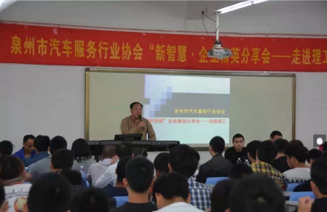4月22日,由泉州市汽车服务行业协会、泉州理工学院、泉州宝通贸易有限公司共同主办,由中正兄弟汽车影音机构、惠安美鹰汽车美容中心、水头建兴之美汽车美容中心、嘟嘟LOOK车灯改装中心、深圳国领电讯公司共同协办的泉州市汽车服务行业协会“新智慧·企业精英分享会”活动在泉州理工学院教学楼二楼238会议室隆重举行。