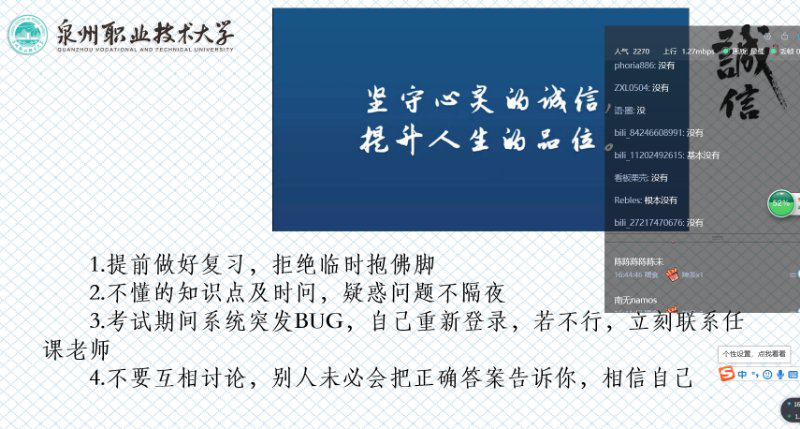 此次会议对象是19级财经学子,期末考试又双叒叕来临,由于疫情影响,学生们不得已采用线上的方式进行考试,希望家长在家全程监考,徐燕琴辅导员关心鼓舞了同学们,告诫他们要诚信考试,懂得诚实守信是中华民族的传统美德,现代社会更需要诚实守信。反对虚假和不守信用的行为,反省自己不诚实不守信的行为,做一个诚信的大学生。增强自信,努力做到说话做事实实在在,表里如一。诚信考试,做文明考生。重要的是一个“诚”字。希望泉大的学子秉承“实事求是,艰苦奋斗”的校风,不负众望,砥砺前行,靠自己的双手撷取果实。