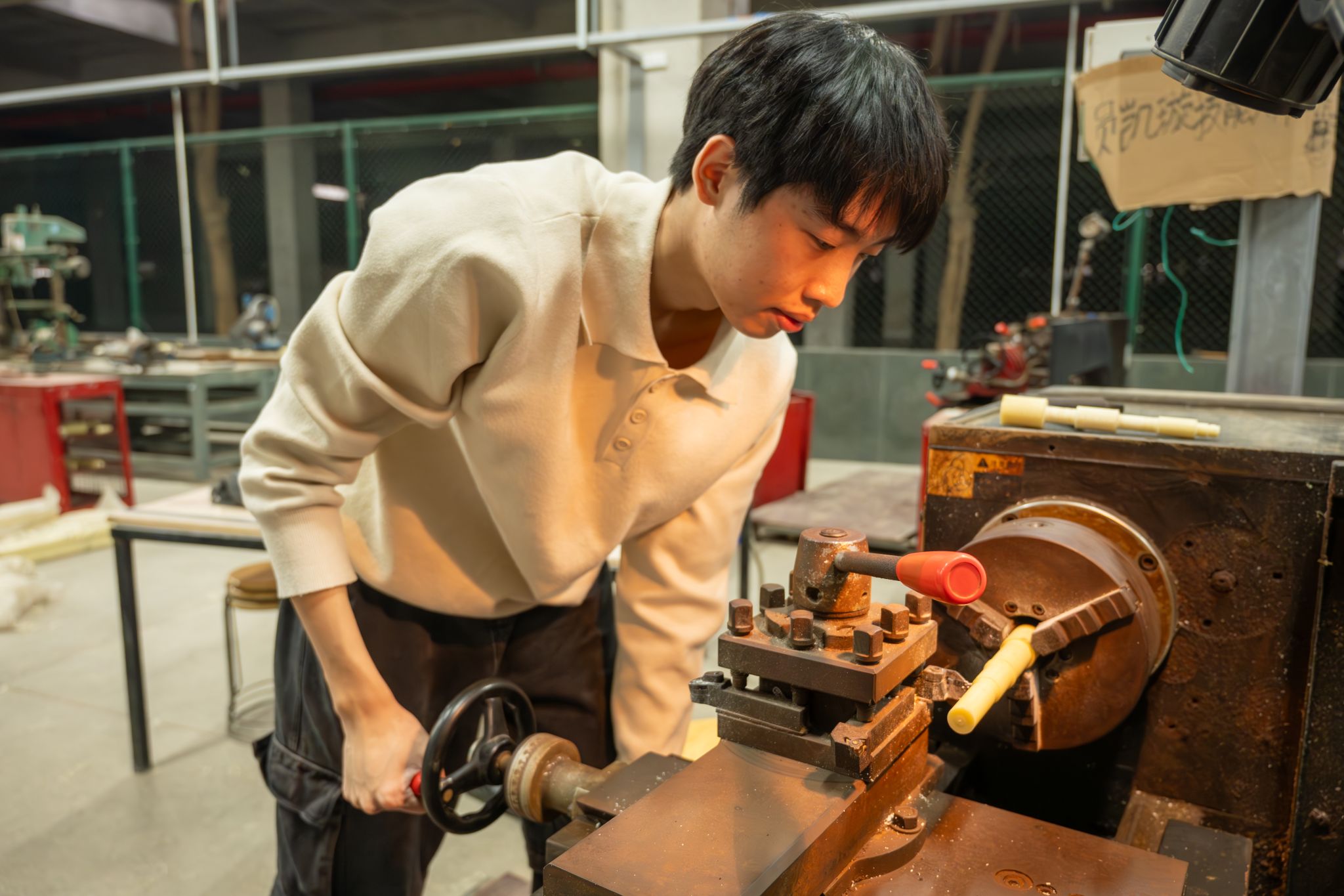 ▲ 方毅在实训室进行普通车床阶梯轴加工专项实操训练